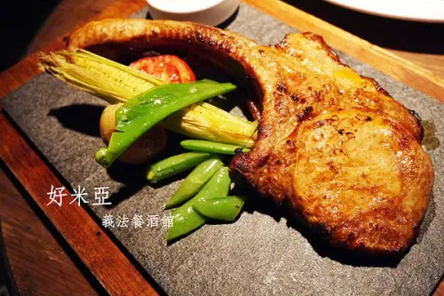 主餐的部份則是超大隻的戰斧牛排,上頭還淋上誘人的松露白醬,顏色好繽粉