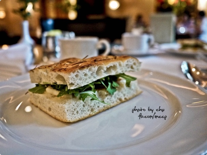 精緻三明治,裡頭有燻鮭魚、起司、番茄,還有一堆芝麻葉