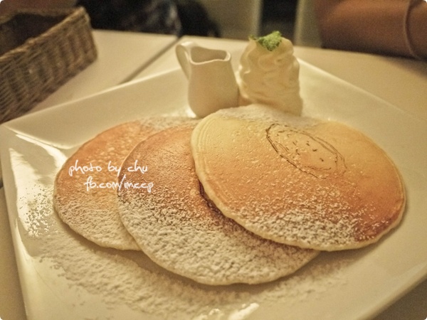 三大塊的原味煎餅躺在盤中,灑上細細的糖粉,只要沾上一點楓糖就很OK囉!