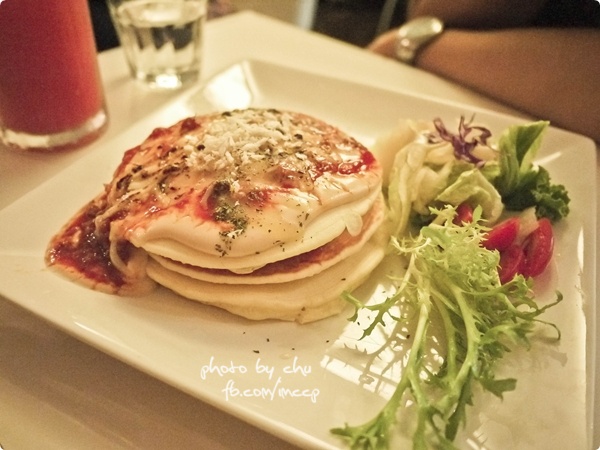 這份煎餅就有點軟了,淋上義式蕃茄醬汁,鹹口味的煎餅...嗯,我還是比較喜歡沾楓糖就好。