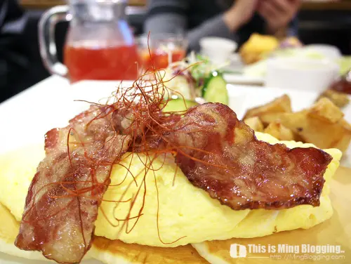 蛋捲有點太水了,導致裡頭有點沒味道,培根的份量在蛋捲裡頭看起來少的可憐。