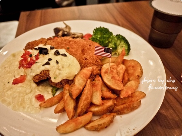 散發檸檬迷迭香的酥炸雞排,再淋上以新鮮洋蔥熬製的濃郁白醬,
