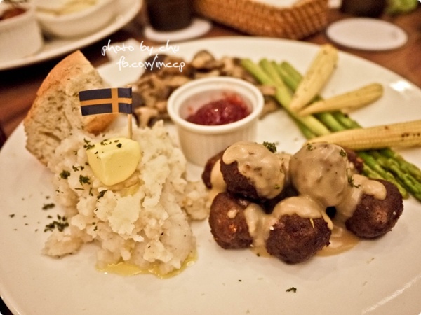 手工牛肉丸淋上濃郁奶醬,搭配着蘆筍與玉米筍等時蔬、炒野菇與自製馬鈴薯泥,比IKEA的豐盛許多啊(當然價格也是)