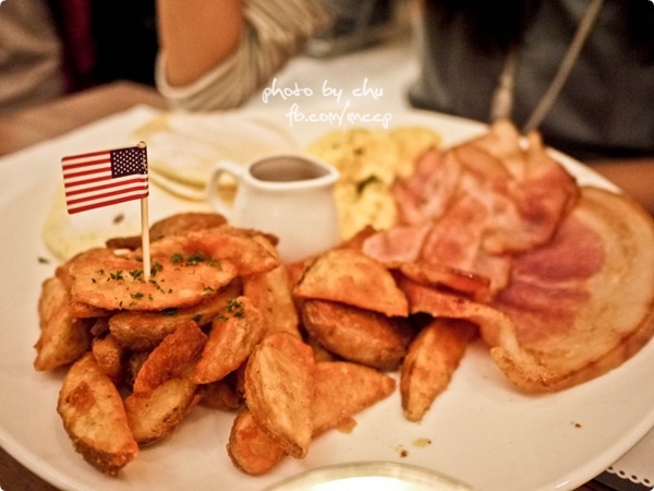 碳烤帶皮燻火腿、香煎培根、美式炒蛋、招牌脆薯與手工鬆餅,道地的美式早午餐~