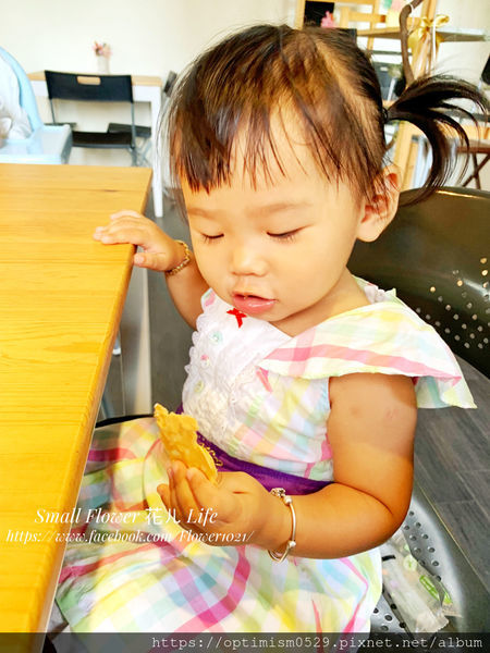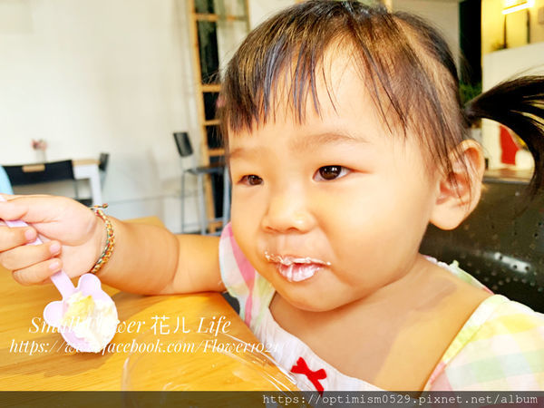 小花品嚐甜點,嘴巴沾滿奶油,模樣太可愛了!