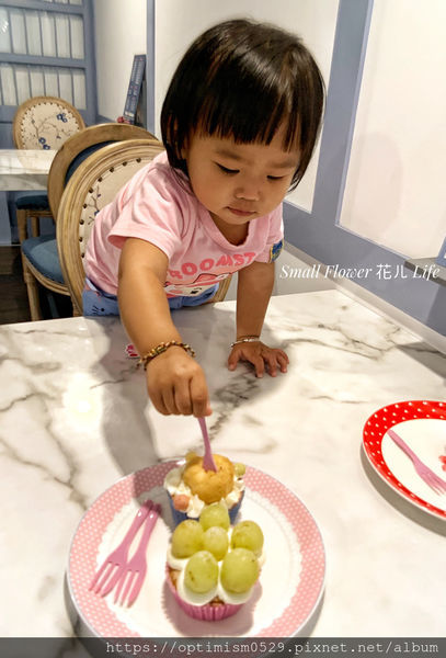 小花模仿欣賞杯子蛋糕,還真的有模有樣,小花如果真可以這樣安靜個半小時該多好 XD