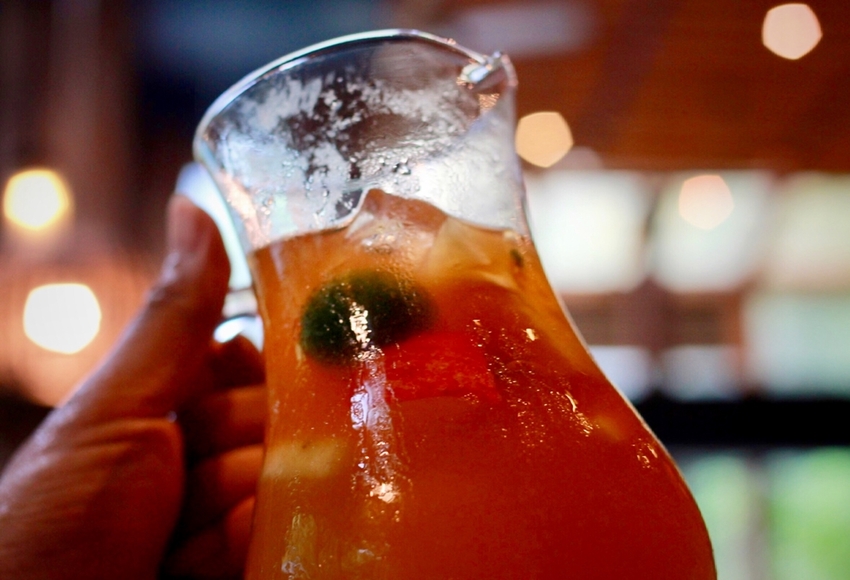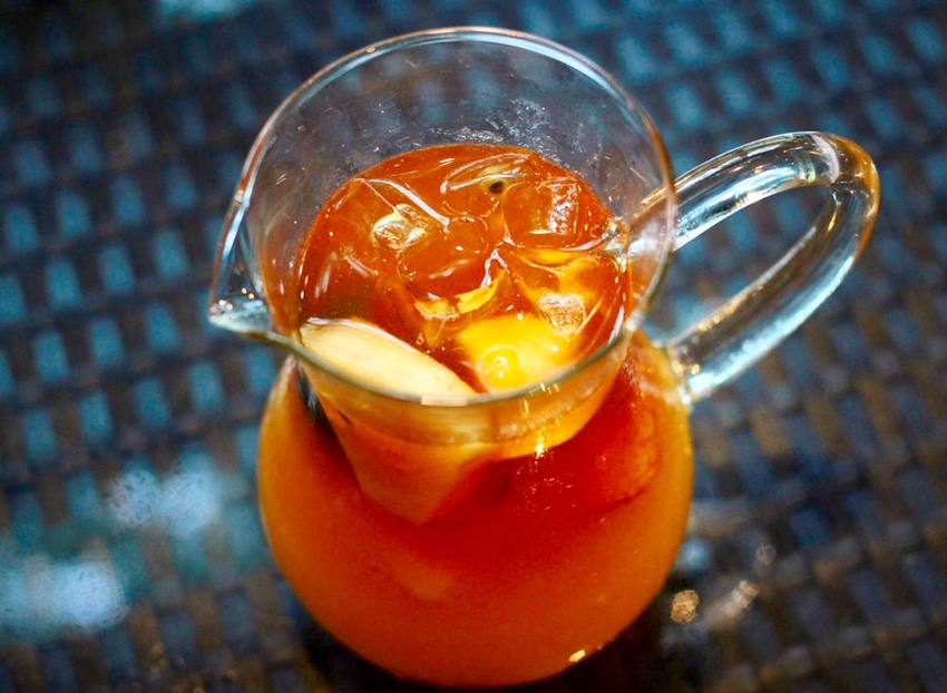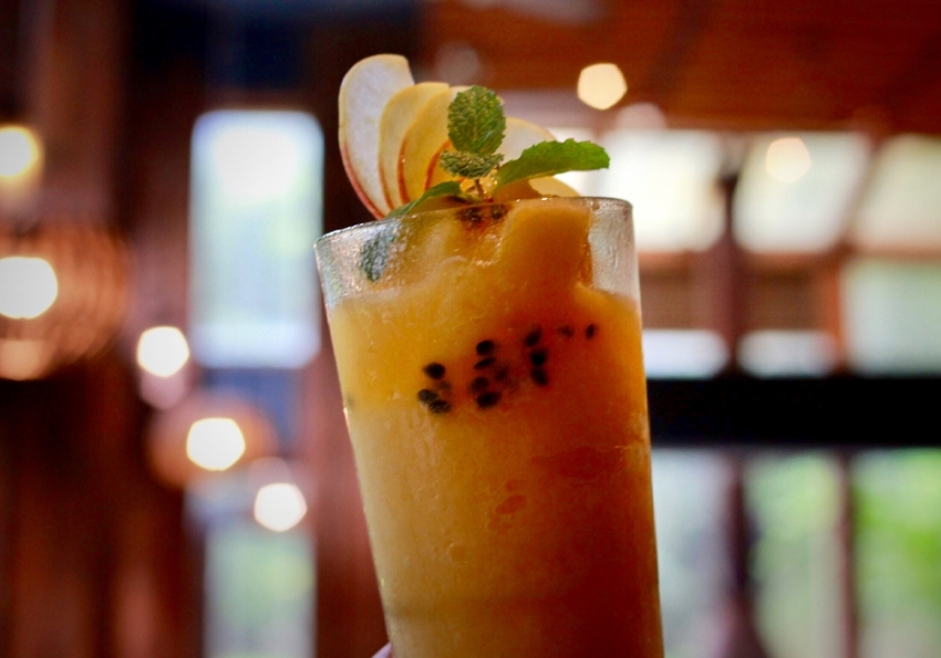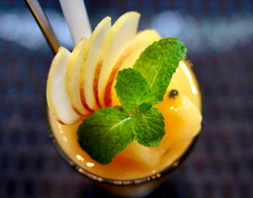 內有新鮮水果鳳梨、蘋果、奇異果、金桔、檸檬、百香果等,金桔味偏重,整個口感其實蠻像金桔檸檬,酸中帶點澀,甜度不太夠,冰冰涼涼喝,還算不錯!