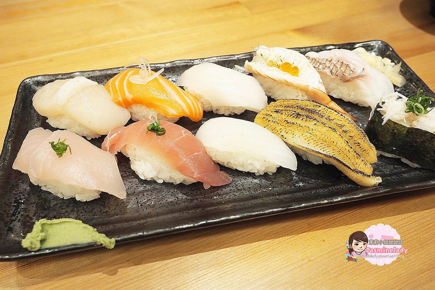 包含:松葉蟹、真鯛、干貝、花枝、鮭魚、鮪魚、海鱺、旗魚、海老、炙燒星鰻。