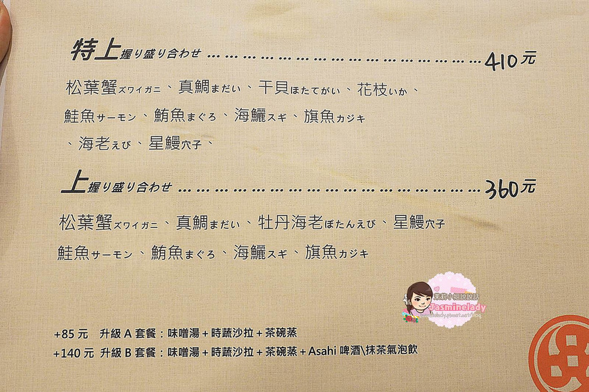 這天比較特別的菜單,是有進貨「日本真鯛」,以「真鯛」為特色的組合握壽司,既然是慶生,我們就點了比較貴的「握壽司特上組合」+140元升級B套餐。