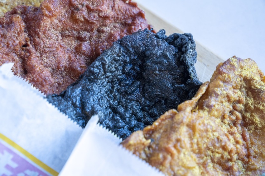 最後是同為假日才有的「猛毒雞排」~外皮以梔子花上色,呈現出非常特別的墨藍色。雞肉本身則是使用義式香料調味醃製,吃起來富有異國風味,就像是香草腿排!