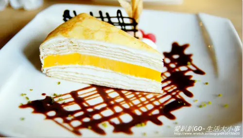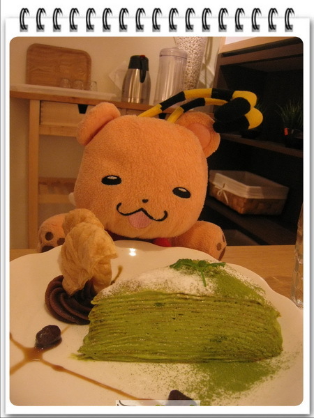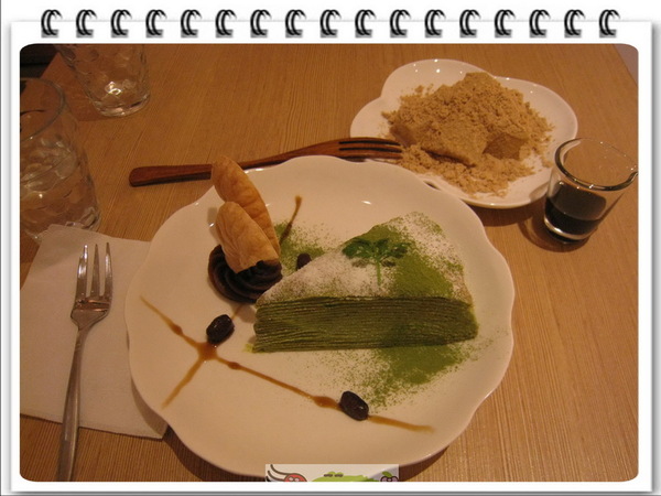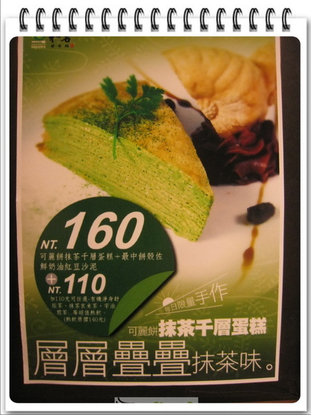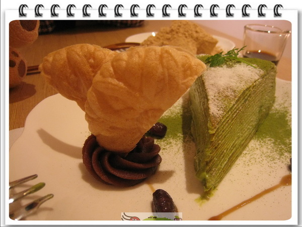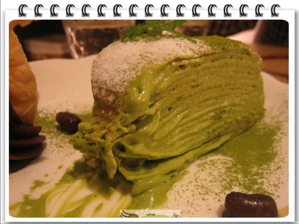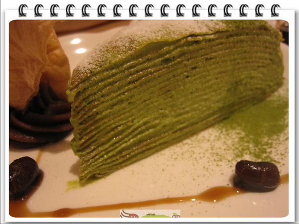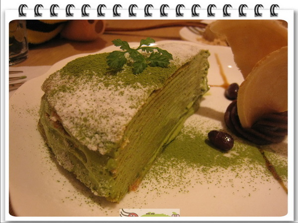 接下來這個就是我點的「抹茶千層蛋糕」,看起來相當漂亮吧?一層層的抹茶可麗餅,算了一下大約有到18層以上喔,中間夾有抹茶奶油,上面還灑了原味的抹茶粉,看起來就相當可口呀!XD