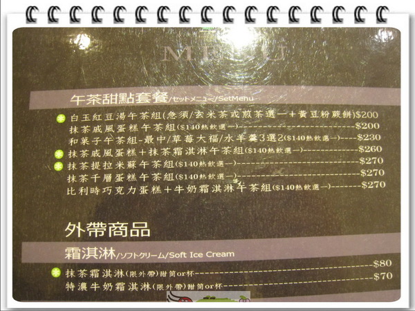 菜單的抹茶甜點種類相當的豐富,有套餐的組合。店內有最低消費120元,所以我們點了一份270元的午茶甜點套餐「可麗餅抹茶千層蛋糕+最中餅殼佐鮮奶油紅豆沙泥」加上有機淨身茶的「抹茶玄米茶」,另外又點了一杯「冰抹茶拿鐵」(120元)。
