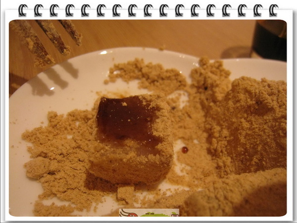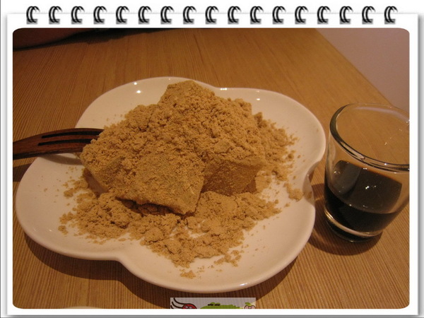雖然旁邊有附上黑糖蜜,不過我還是喜歡吃沾黃豆粉的原味,不過還是照了一張黑糖蜜傾倒在黃豆粉上的照片~XD