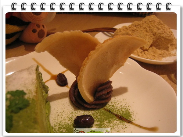 這是用卷送的「黃豆粉蕨餅」!(雖然也可以選手工餅乾,不過來這邊不選日式甜點就太可惜了!XD)蕨餅的味道還不錯,配上黃豆粉果然視覺配呀!XD