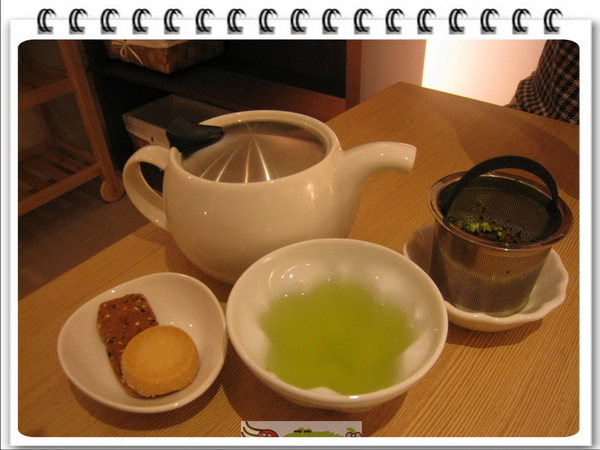 我點的飲料是有機淨身茶的「抹茶玄米茶」,這種茶都有附上餅乾。茶喝起來很不錯,玄米和抹茶的味道一向很和呀,喝起來很溫和,而且可以回沖喔!(不習慣喝太濃的建議可以先泡一下後,再將茶葉和玄米拿出來,等要回沖時再放進去。)