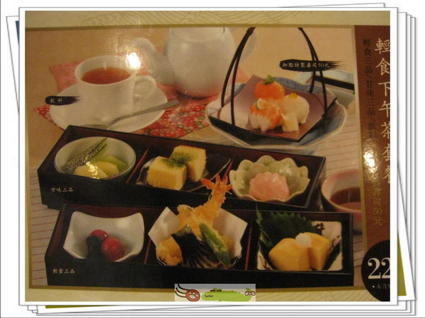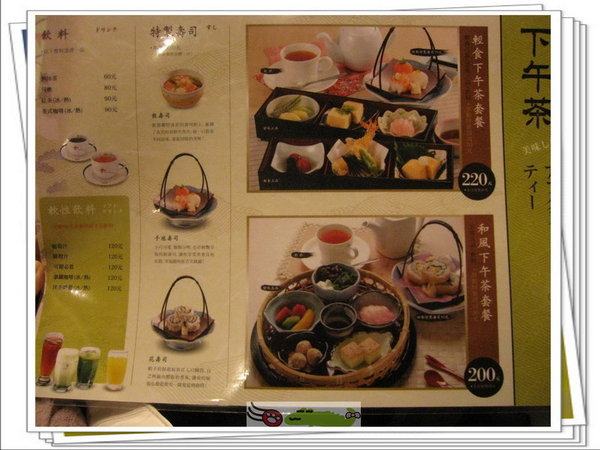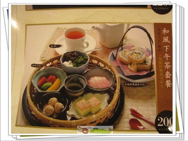 這邊平日下午2點到4點限定的下午茶有兩種,就是「和風下午茶套餐」(200元)和「輕食下午茶套餐」(220元),另外可以加價50元換旁邊三種不同壽司三選一,有「散壽司、手毬壽司和花壽司」可供選擇,飲料如果加30元可以換成果汁或可爾必思。不過因為這邊的下午茶熱紅茶是一壺的,可以慢慢喝,也可以續沖,所以當然要點熱茶啦!XD