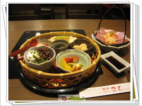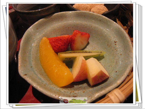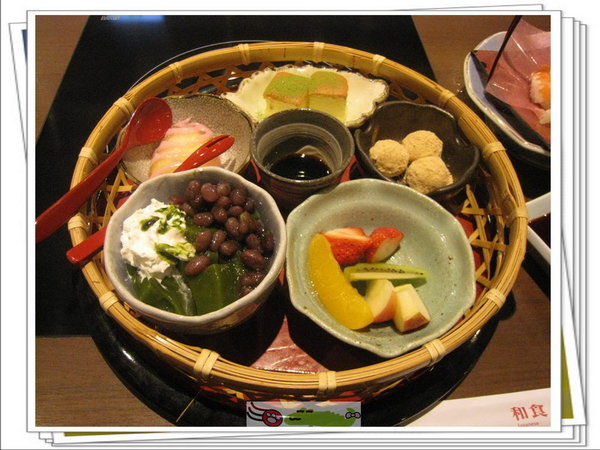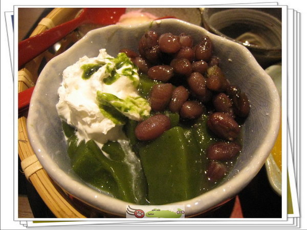 這個是和果子類的甜點,外面的皮像麻糬一樣,不過是透明的看起來蠻漂亮的(其實還蠻像涼丸的外皮耶~),裡面竟然是鳳梨口味的醬,加上紅豆,算是令人相當驚訝的一道甜點。因為本來以為裡面應該是奶油或一些紅豆餡之類的,不過比起那些甜膩的餡料,這樣的口味倒是還不錯啦!