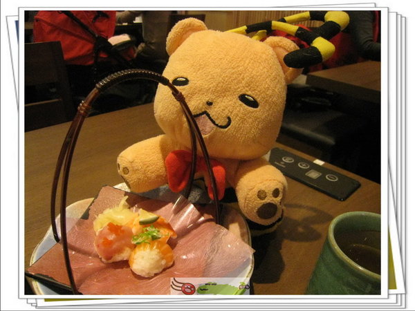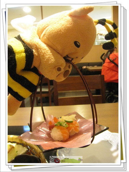 看蜜蜂熊想偷偷將壽司據為己有,不過提不起來呀!!XDD