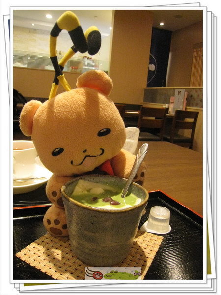 「抹茶凍」,這個跟甜點中的「蜜豆抹茶凍」是一樣的,本來應該要加上中央那個黑糖蜜,不過因為蜜蜂熊不喜歡吃太甜的,所以沒有加,只吃他的原味,如果直接吃的話,會感覺抹茶凍帶有抹茶的香味和些許的抹茶苦味,算是還不錯,不過旁邊的奶油融化掉後,味道就比較中和。
