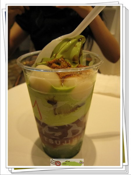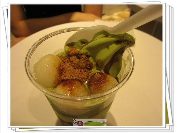 可以看到白玉團子不算小,而且上面灑的黃豆粉也蠻香的,我覺得唯一我不喜歡的一點就是上面的黑糖。XD我是覺得冰淇淋本身就已經甜了,所以不需要特別再淋上黑糖就很好吃啦!是有點多餘的感覺。畢竟台灣人的口味跟日本還是有差別的啦!但是抹茶冰淇淋的味道倒是覺得甜度適中,不會太甜,而且香味濃郁。
