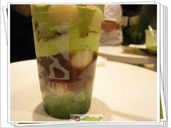 上面是抹茶冰淇淋,還灑上了黃豆粉,旁邊白白的那些就是白玉團子,中間當然也是抹茶冰淇淋,顏色比較暗的部分就是紅豆,不過這個聖代的紅豆算是比較少的了,沒有像菜單圖片中的那麼多!最下面則是抹茶口味的碎冰。