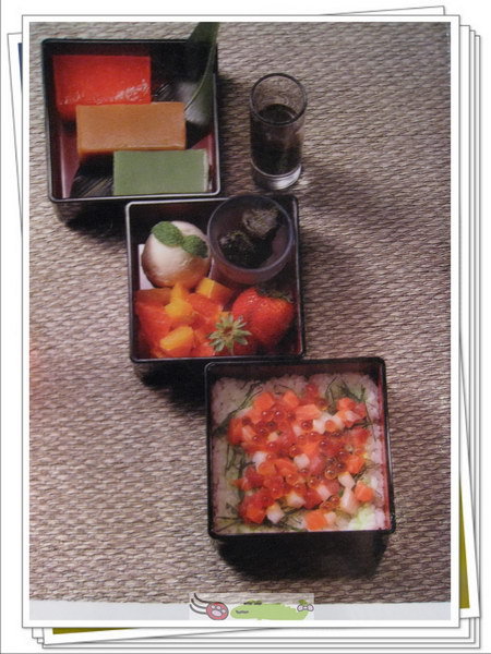 到底是怎樣的「珠寶盒時光」^^吸引我呢?就是像下面這張圖片一樣啦,有沒有很漂亮?(笑)好吧,我承認有一部份是被三層的盒子給吸引的,不過就是這樣才吸引人呀!而且三層中,有一層是鹹的散壽司,這樣蠻特別的吧!