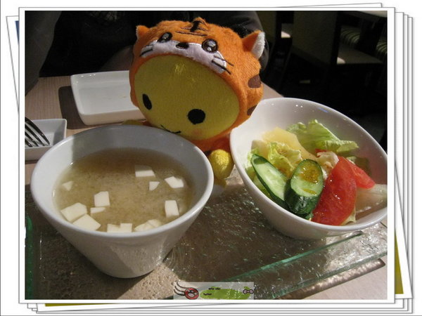 沙拉普通,用的是和風芥子醬,沒有多特殊。湯品的話雖然另外還有「MISO豆汁巧達湯」可以選擇,不過因為不是很喜歡裡面含有奶油和豆漿的湯,所以還是選擇比較清淡的味增湯。(雖然蜜蜂熊可以接受豆漿火鍋,不過混雜太多種味道的就不是很想嘗試了~笑~)
