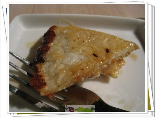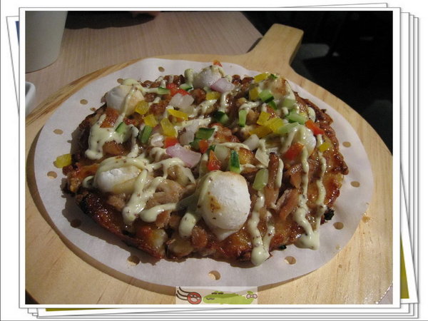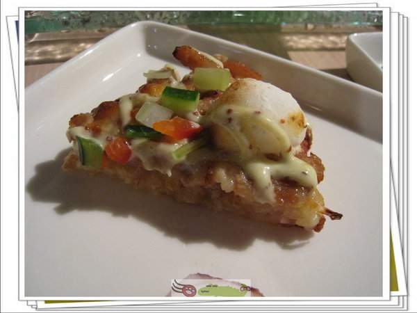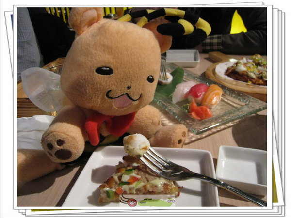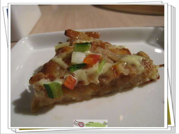 上桌的時候,有傻到因為上面好多美奶滋呀~(蜜蜂熊最不喜歡的就是美奶滋呀~哭~)不過吃到嘴裡的口感還不錯,因為是米披薩,所以下面的餅皮當然就換成是米囉~這樣咬下去吃起來還頗像是摩斯的薑汁米漢堡一樣耶~(笑)