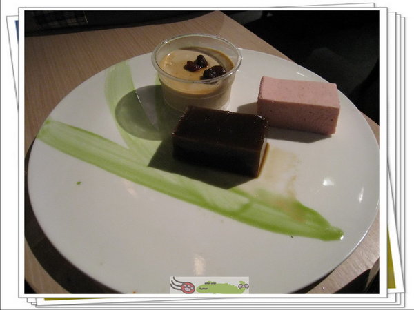 小姐說每天不一定,今天的是「草莓慕斯,黑糖羊羹和黑糖奶酪」,底部的綠色裝飾是抹茶!