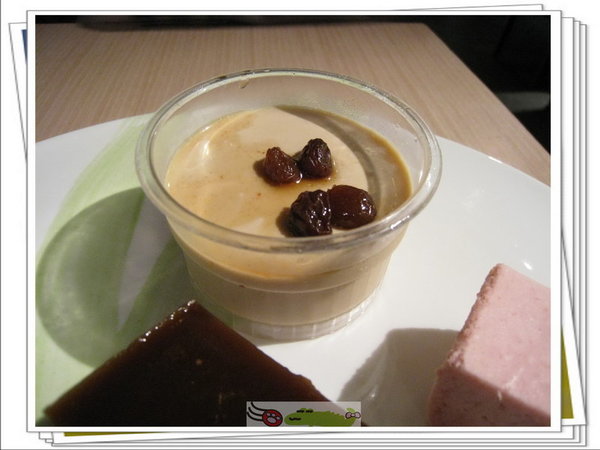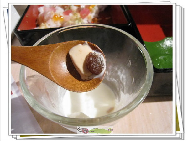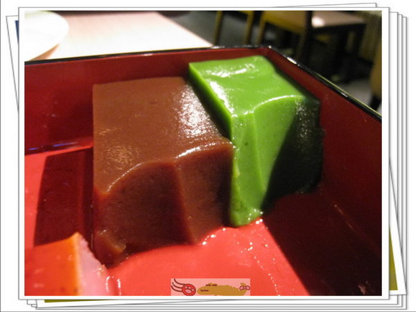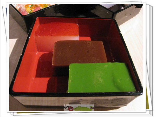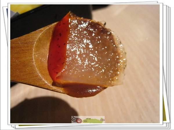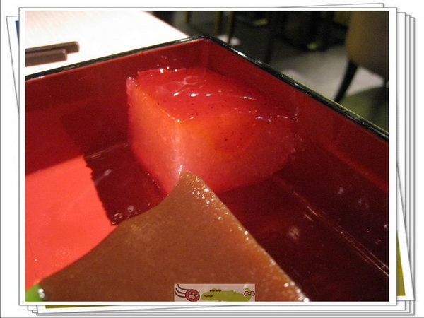 比較令人好奇的就是這個「大根羊羹」啦,沒有錯,就是所謂的「蘿蔔羊羹」喔!用的是白蘿蔔,所以看起來有點白白透明的顏色,咬下去可以感受到白蘿蔔的味道耶~。不過上面用的小姐說是梅子醬汁。不過這種梅子醬汁的味道有點太甜了,我比較期待的是像日式梅子有點微酸的味道。