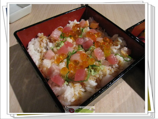 當然要先吃鹹的啦,就是這盤充滿海鮮的散壽司,雖然海鮮沒有很多,但是散在飯上面的鮭魚卵,很像是珠寶一樣閃亮亮呀!吃起來的口味不錯,配上醋飯,剛好可以當點心的前菜!