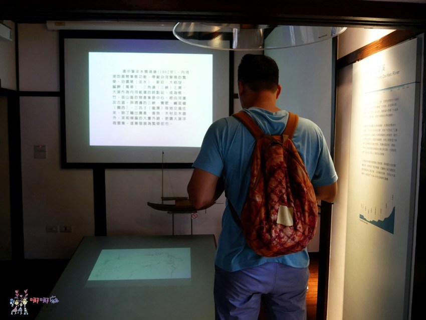 館內不只有展覽的陳設,還有一些互動的設施,像這邊的是在介紹大溪以前河運還很昌盛時期的景況,透過上面的透明罩子,可以聽到一些蟲鳴鳥叫還有水流聲,搭配文字意境,讓人不知不覺就彷彿回到當年的大溪。