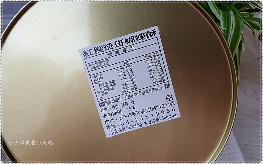 鐵盒底部貼上紅髮斑斑蝴蝶酥的成分、熱量、有效期限15天、資訊等..