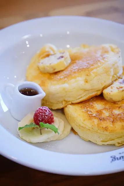 跟一般我們常吃的格子鬆餅,比利時鬆餅製作方式不同,舒芙蕾鬆餅是使用低溫煎焙的方式。