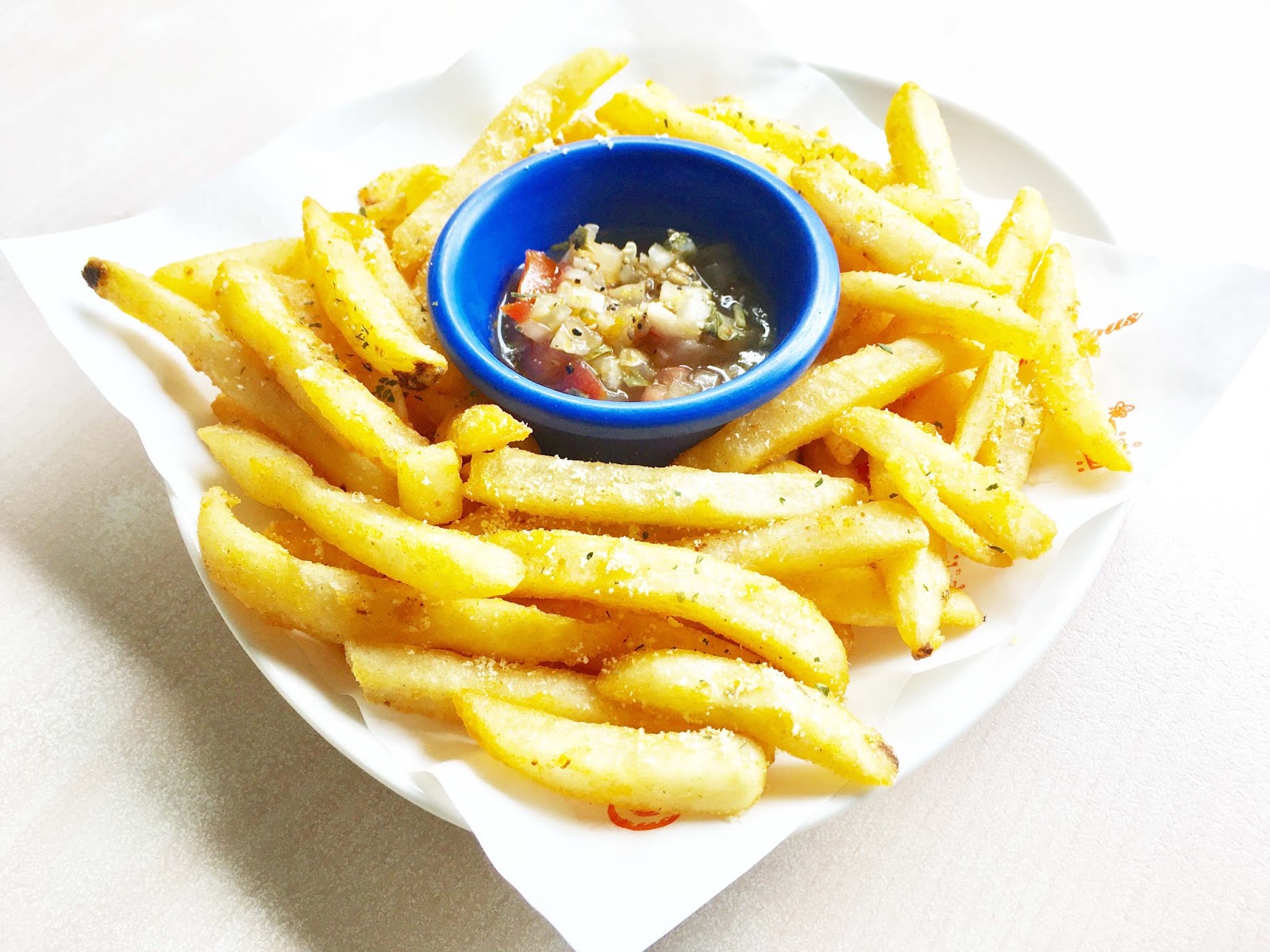 外酥脆、內鬆軟的「金黃薯條」,沾著酸甜的手作莎莎醬一起吃,口感清爽,一吃就上癮,是很適合夏日的點心。