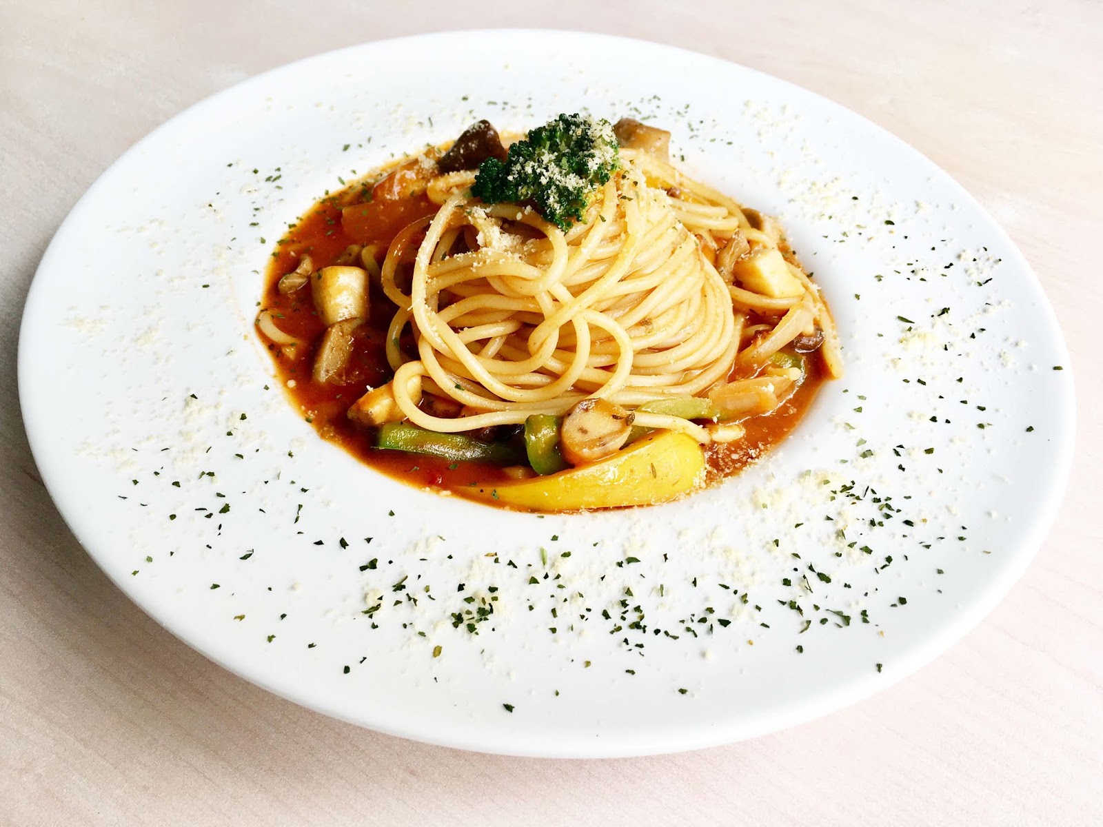 「紅醬義式香草辣味嫩雞義大利麵」的Q彈麵體上吸附了手工熬煮的酸甜番茄醬汁,搭配微辣香嫩的雞肉塊和滿滿的現烤時蔬,鮮甜爽口的滋味讓人意猶未盡。