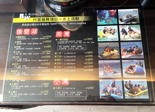 桌上有一張水上活動的服務項目DM,據櫃檯說入住的客人會比較優惠喔!如果有計劃去海邊玩,可以委託櫃檯代訂。