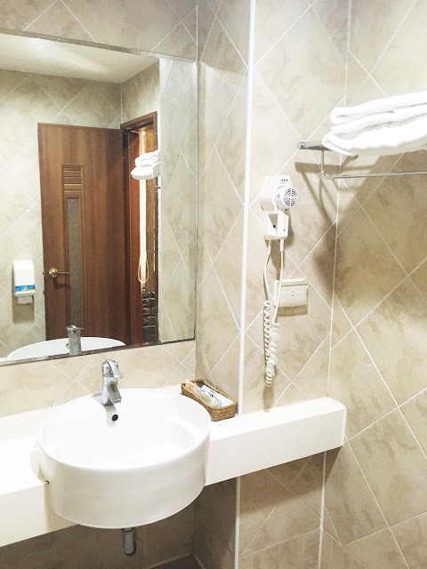 浴室擺設較簡單,無乾濕分離,作為一人洗澡的空間還夠用,幫小孩洗澡就有點侷促。洗手台邊有個小設計讓我覺得很貼心,插座竟然是有蓋板的!避免水濺到插座而觸電。