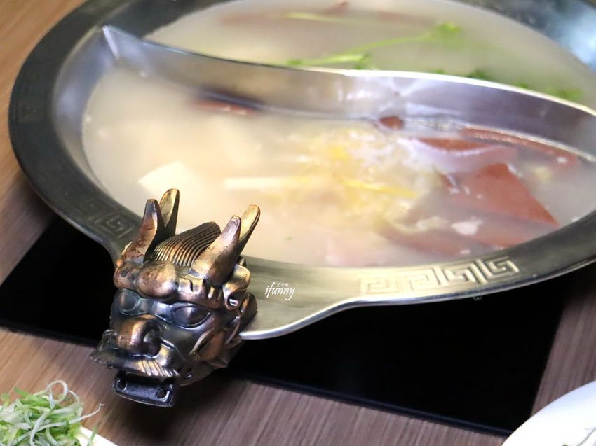 如同香菜皮蛋鍋一般清爽的湯底,是吃火鍋時低熱量的好選擇喔!略帶乳白色的牛骨湯裡有著香菜、皮菜,另外當然也有吃到飽的鴨血及豆腐。