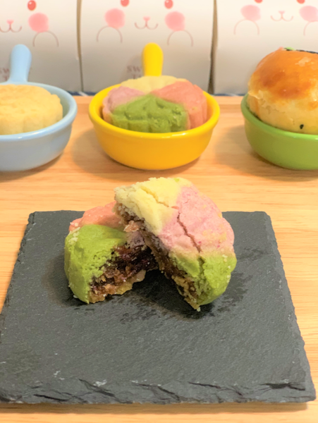 外層表皮是使用抹茶粉、紫薯粉以及覆盆子粉調和出的優雅顏色