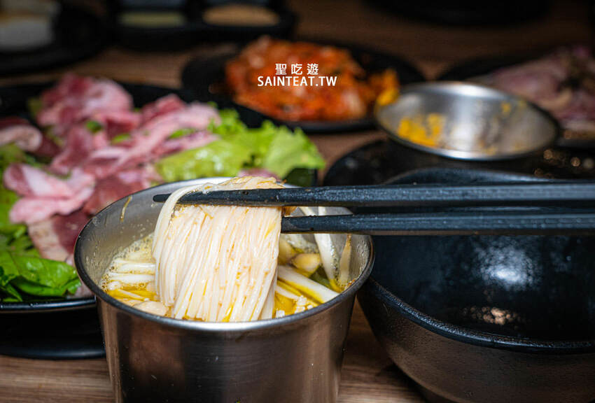 - 包肉生菜、蔬菜餅皮、蛤蜊絲瓜、奶油金針、地瓜起司、洋蔥絲、韓式泡菜、鮭魚飯糰、茶漬泡飯。