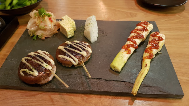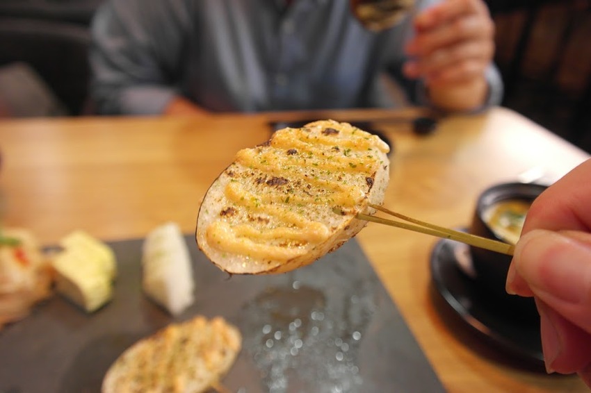 來到基隆除了逛夜市外也不可錯過全台唯一日式鐵板串料理將日本料理,以鐵板燒烹調方式呈現食材美味並設有充滿日式風格的包廂家庭聚會、商業酬酢~絕對是最佳首選!!巷弄間的美味不可錯過的無雷料理!!手作新鮮美味手塩-日式鉄板串料理位於熱鬧的基隆夜市每到假日總是擠滿人山人海的觀光客基隆夜市美食眾多,但是....你一定吃過日本料理,但是你吃過用鐵板燒製作烹調的日本料理嗎??位於基隆市中正區義二路2巷的巷子裡面有一家非常特別的巷弄隱藏版美食將日本料理串燒的美味,用鐵板燒的方式完整呈現加上裝潢風格充滿濃濃的日本味來此用餐享受美食之餘,也不要忘記來杯美酒美好的一餐,就從這裡展開提醒您,未滿十八歲禁止飲酒引進日本大阪鐵板創意料理一進門就看到牆壁上好多水龍頭??其實這是獨特耗費重資設計的酒牆,能供應多達十五種的佳釀新鮮供應除此之外,日本啤酒類這邊也同步提供提醒您,未滿十八歲禁止飲酒獨特創意的空間布置,連牆壁都是用真的石頭打造塗鴉大師阿諾ANO創作畫作,充滿濃厚的日本風味一樓屬於一般座位區,二樓則是包廂區一樓的部分如果你坐在吧檯,可以現場欣賞廚師們精湛手藝至於坐在下方座位的朋友,大大的電視牆播放精彩的電視讓你目不轉睛店家十分貼心提供無線充電服務簡單機步驟,下載專屬APP手機立即無線充電輕鬆簡單又方便這樣就不用擔心,手機忽然沒電,沒法拍照及時分享美食給朋友喔!!貼心提醒,不是每個座位區都有提供像是吧檯部分就沒有提供詳細需求請洽服務人員另外也提供海鹽及七味粉供您做食物的調味今天來品嘗饗相伴雙人套餐以下將針對雙人套餐提供大家經驗分享當然另外也有單點可以選擇想要如何選,看大家喜好^<^套餐汽水除了汽水外,也有提供免費的熱麥茶招待開胃菜毛豆在上正式串燒同時服務員會先將石板放置桌上這石板可有大大的用意除了擺放串燒外也有保溫的效果維持串燒的最佳口感喔!!三樣開胃小菜,搭配串燒食用,可感更加分別為辣泡菜、玉子燒、醃白蘿蔔尤其辣泡菜非常開胃!!!鯷魚香菇鑲肉與辣味噌筊白筍鮮甜的筊白筍經由鐵板烹調完整保留下來並淋上辣味噌醬汁,口感獨特非常開胃鯷魚香菇鑲肉正面是香菇,而背面包覆鮮甜豬肉經過鐵板精心烹調下香滑好吃不油膩肉汁完整包覆