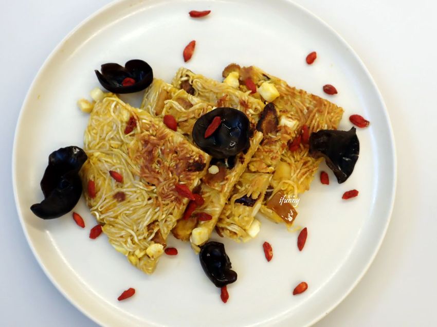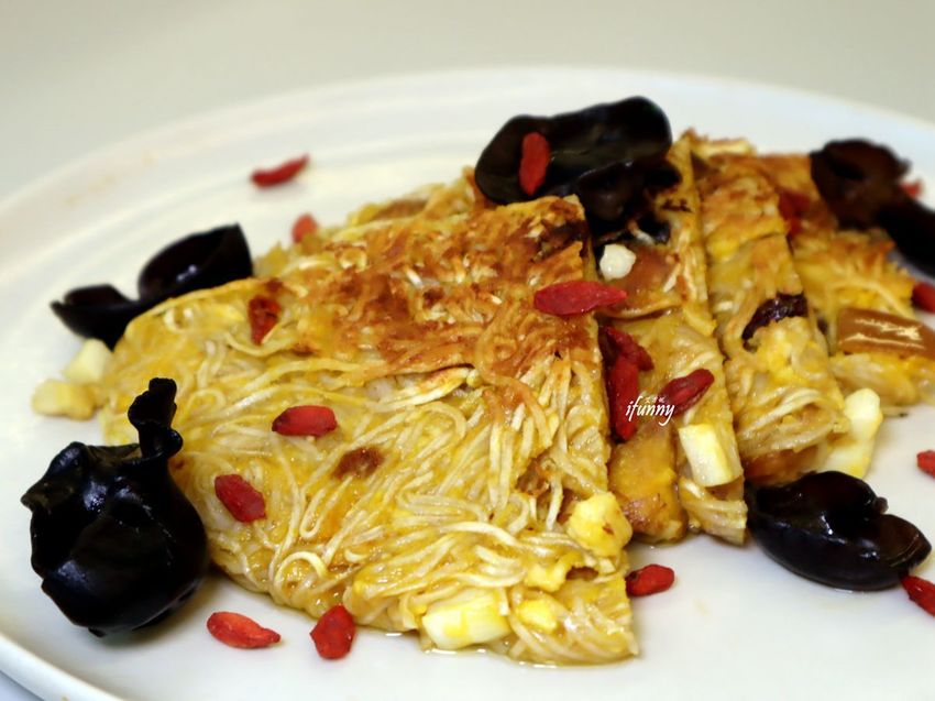 這個麵線煎加了蛋液煎成圓形,其間還能嚐到菇類的口感,一旁搭配了木耳及枸杞配色。煎過的麵線帶著香脆彈口感,麻油香氣誘發食慾。