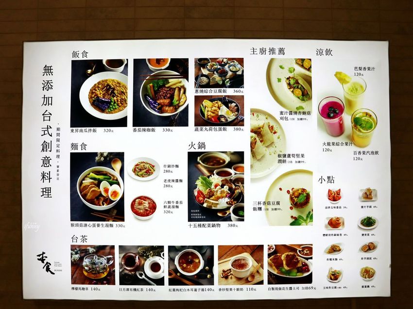 BunShi 本食提供飯類、麵類、火鍋、台茶、涼飲及小點。餐點有全素、奶素及五辛素,建議有飲食限制的人,先跟服務人員確認一下。