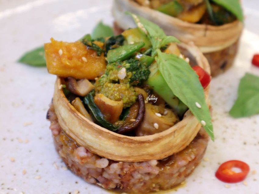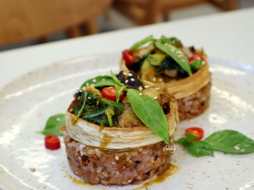 一上桌盡是三杯的香氣,扁平的十穀飯糰上先以炸牛蒡圈成外圍,裡頭是豐富的香菇、豆腸、南瓜等搭以三杯醬汁呈現。塔香味十足,加上醬汁味道是熟悉的三杯塔香,是令人喜出望外的好滋味!多層次的口感也相當討喜。