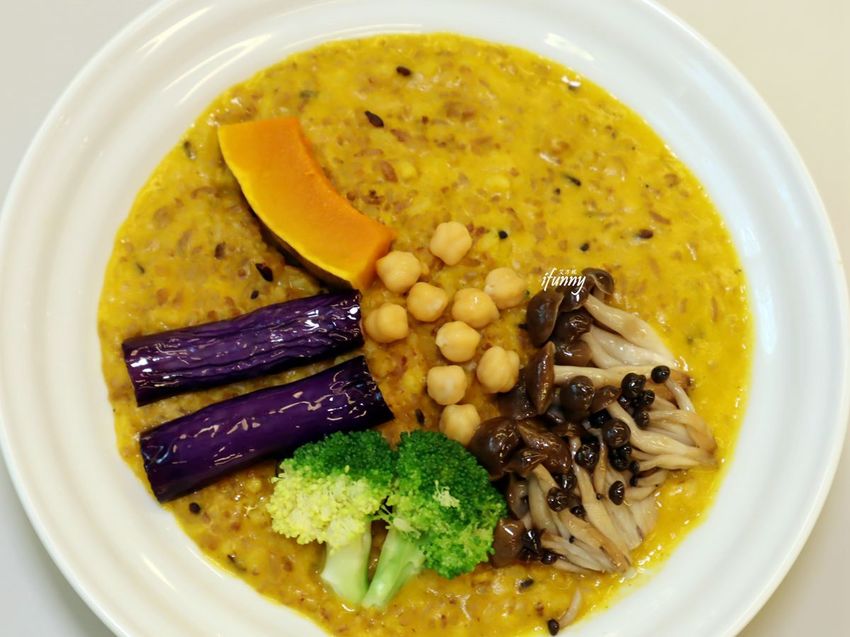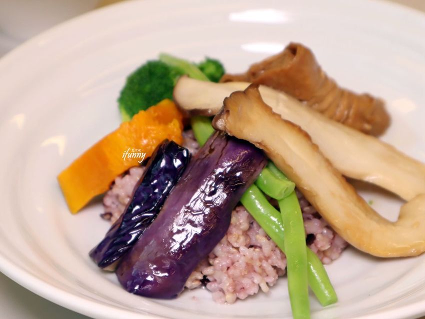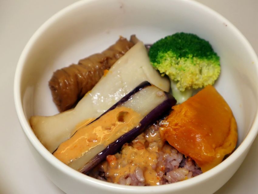 除了其上的東昇南瓜之外,還搭配茄子、綠花椰、鴻禧菇及鷹嘴豆。而雖稱為拌飯,但其濕潤度比較像是燉飯的口感。天然南瓜帶來的天然的甜度,細細品嚼出其鬆軟綿密的好滋味。
