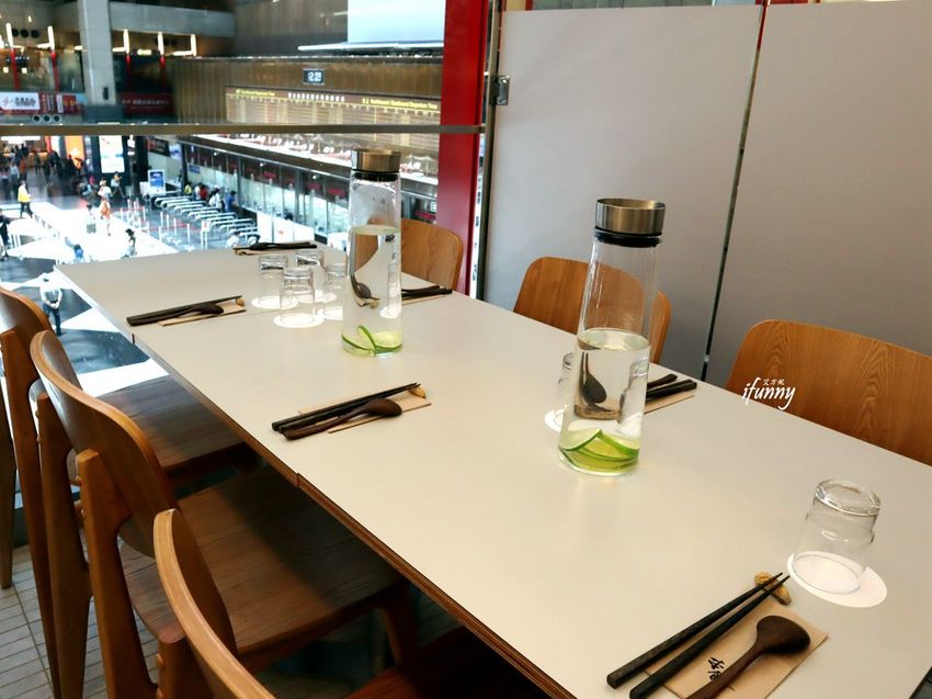 每張桌上都貼心地備有檸檬水,玻璃窗外就是台北車站有名的黑白棋盤大廳。‧