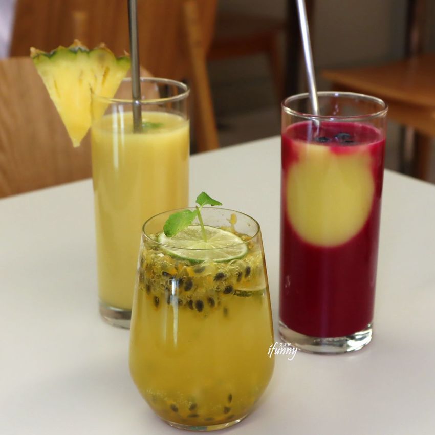 百香果檸檬氣泡飲、火龍果綜合果汁、鳳梨香果汁 $120