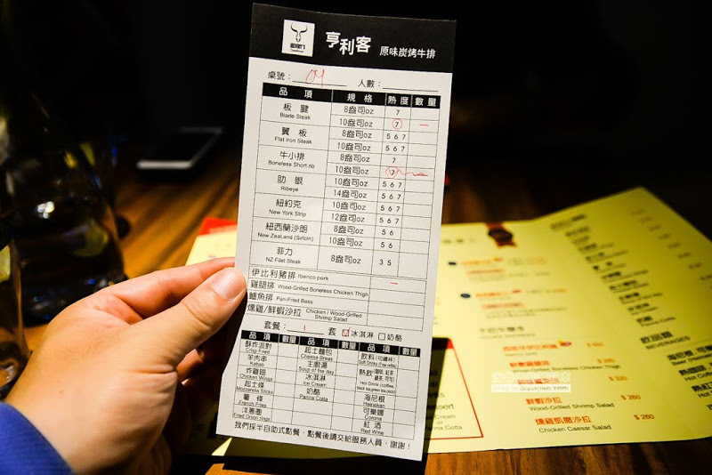 點餐是直接在這張點菜單上面畫記,然後交給櫃台,用餐完畢了再拿著帳單去櫃檯結帳