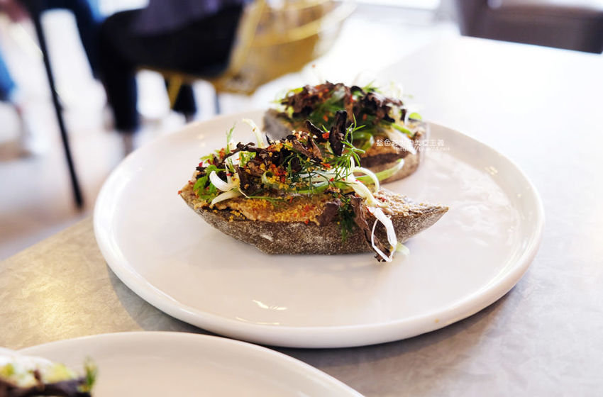 上頭有黑喇叭菇、烏魚子、新鮮香草,抹醬是磨菇醬,從麵包就很用心,賣相也美美的~